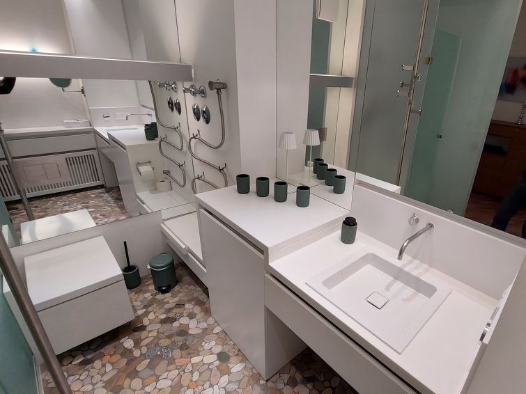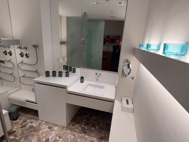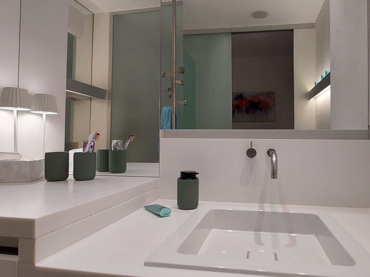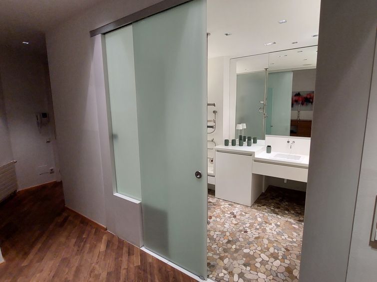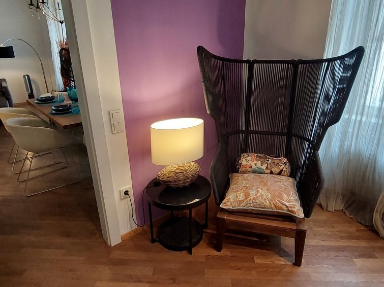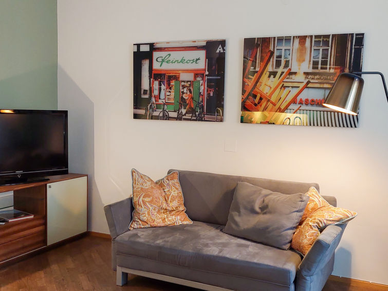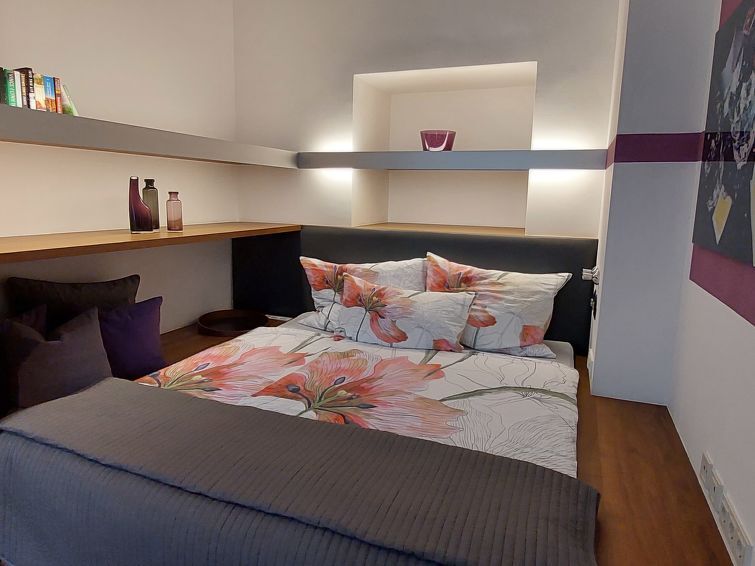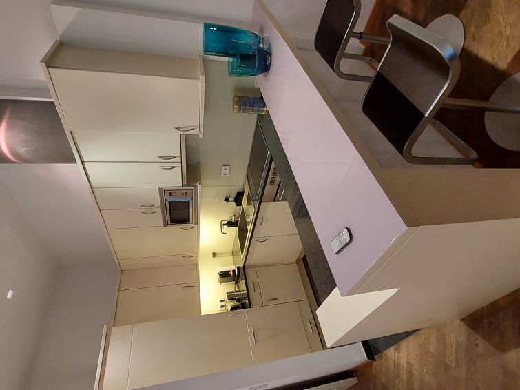 Appartement 2-kamers 70 m2 op de 3e verdieping. Zeer modern en stijlvol ingericht: hal. Woon-/eetkamer met 1 uitschuifbaar bed (2 pers. 2 x 80 cm, lengte 200 cm), eettafel en Flatscreen TV. 1 2-pers. kamer met ventilator. Open keuken (oven, afwasmachine, 4 keramische glas kookplaten, broodrooster, waterkoker, magnetron, diepvriezer, elektrische koffiemachine, pads voor de koffiemachine (Nespresso)) met kleine bar. Douche/WC. Parketvloeren. Ter beschikking: wasmachine, strijkijzer, haardroger. Internet (WiFi, gratis). Niet rokers woning.