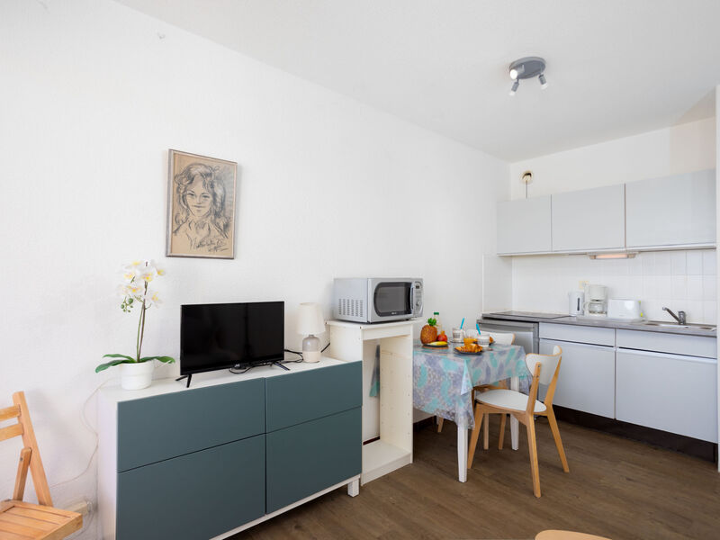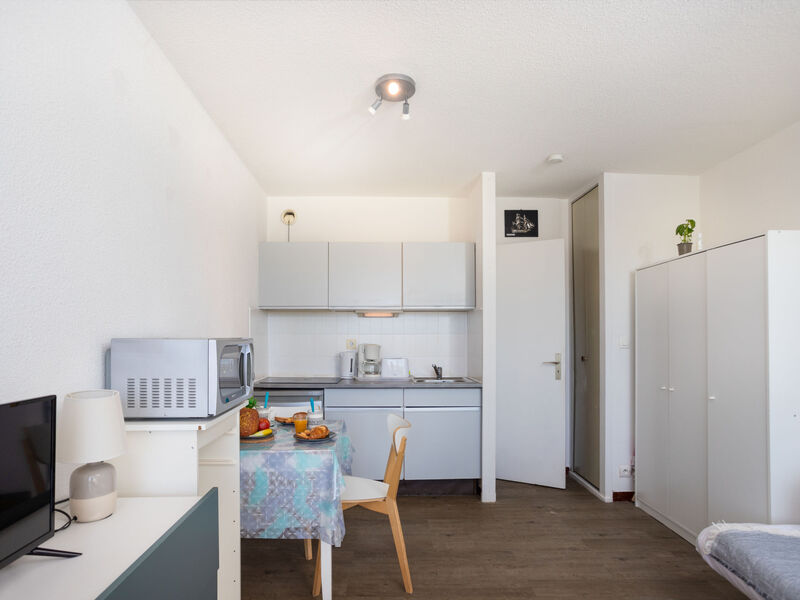 Appartement 1-kamer 21 m2 op de 2e verdieping. Woon-/eetkamer met 1 2-pers divanbed (130 cm, lengte 190 cm), TV (Flatscreen TV). Hal met 1 x 2 stapelbedden (80 cm, lengte 190 cm). Kookhoek (3 keramische glas kookplaten, broodrooster, waterkoker, elektrische koffiemachine, combimagnetron). Douche/WC. Terras 8 m2, op het zuiden gelegen. Terrasmeubelen. Uitzicht op het zwembad. Ter beschikking: Internet (Internet (WiFi), extra). Parkeerplaats. Maximaal 1 huisdier/hond toegestaan. Rookmelders.