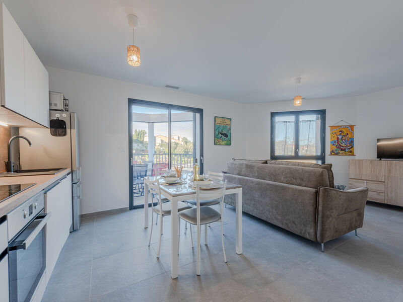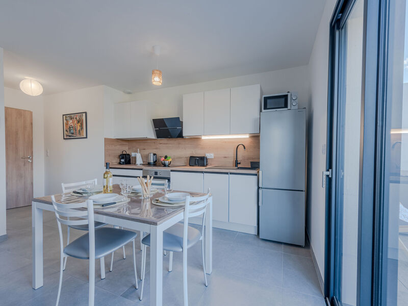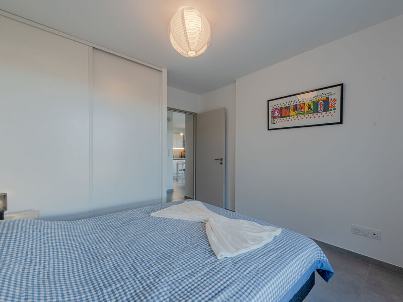 Appartement 2-kamers 43 m2 op de 1e verdieping. Mooi ingericht: woon-/eetkamer met 1 2-pers divanbed (160 cm, lengte 195 cm), TV (Flatscreen TV). Uitgang naar het terras. 1 kamer met 1 2-pers bed (160 cm, lengte 200 cm). Open keuken (oven, afwasmachine, 3 inductiekookplaten, broodrooster, waterkoker, magnetron, diepvriezer, elektrische koffiemachine, pads voor de koffiemachine (nespresso) extra). Douche, aparte WC. Air-conditioning, heteluchtverwarming. Terras 9 m2, op het noordoosten gelegen. Terrasmeubelen. Uitzicht in de verte op zee. Ter beschikking: wasmachine, strijkijzer. Internet (WiFi, gratis). Parkeerplaats (1 Auto). Niet rokers woning. Rookmelders. Aanbod door een particulier volgens art. 155, IV van CGI.