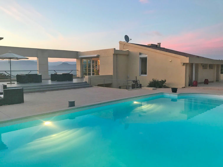 Huis 7-kamers 300 m2 op 2 verdiepingen. Comfortabel en modern ingericht: hal met douche/WC. Salon met TV (Flatscreen TV), air-conditioning. Uitgang naar het terras. Groot woon-/eetkamer met panoramavenster met air-conditioning. Uitgang naar het terras, naar het zwembad. Open keuken (oven, afwasmachine, 4 inductiekookplaten, magnetron, diepvriezer, elektrische koffiemachine). Uitgang naar het zwembad. Souterrain: 1 groot kamer met Kleedkamer met 1 2-pers bed (1 x 180 cm, lengte 200 cm), bad, aparte WC, bad/douche, dubbele wastafels, hot tub en air-conditioning. Uitgang naar de tuin. 1 kamer met 1 2-pers bed (1 x 160 cm, lengte 200 cm), TV (Flatscreen TV). 1 kamer met 1 2-pers bed (1 x 140 cm, lengte 200 cm), wastafel. Uitgang naar het terras, naar het zwembad. Douche/WC. Verwarming. Terras 100 m2, op het zuidwesten gelegen terras 70 m2, op het oosten gelegen, tuin. Terrasmeubelen, barbecue, ligstoelen (6). Zeer mooi panoramazicht op het landschap en het bos. Ter beschikking: wasmachine, droger, strijkijzer, haardroger. Internet (WiFi, gratis). Parkeerplaats (omheind, 4 Auto's). Niet geschikt voor kleine kinderen. Maximaal 1 huisdier/hond toegestaan. Rookmelders. Bijgebouw (toegang via buitentrap): 1 slaapkamer met 1 tweepersoonsbed (180x200), airconditioning. 1 kamer met 2 bedden (2x 90x200), airconditioning. Bad / aparte WC. 8310700023358
